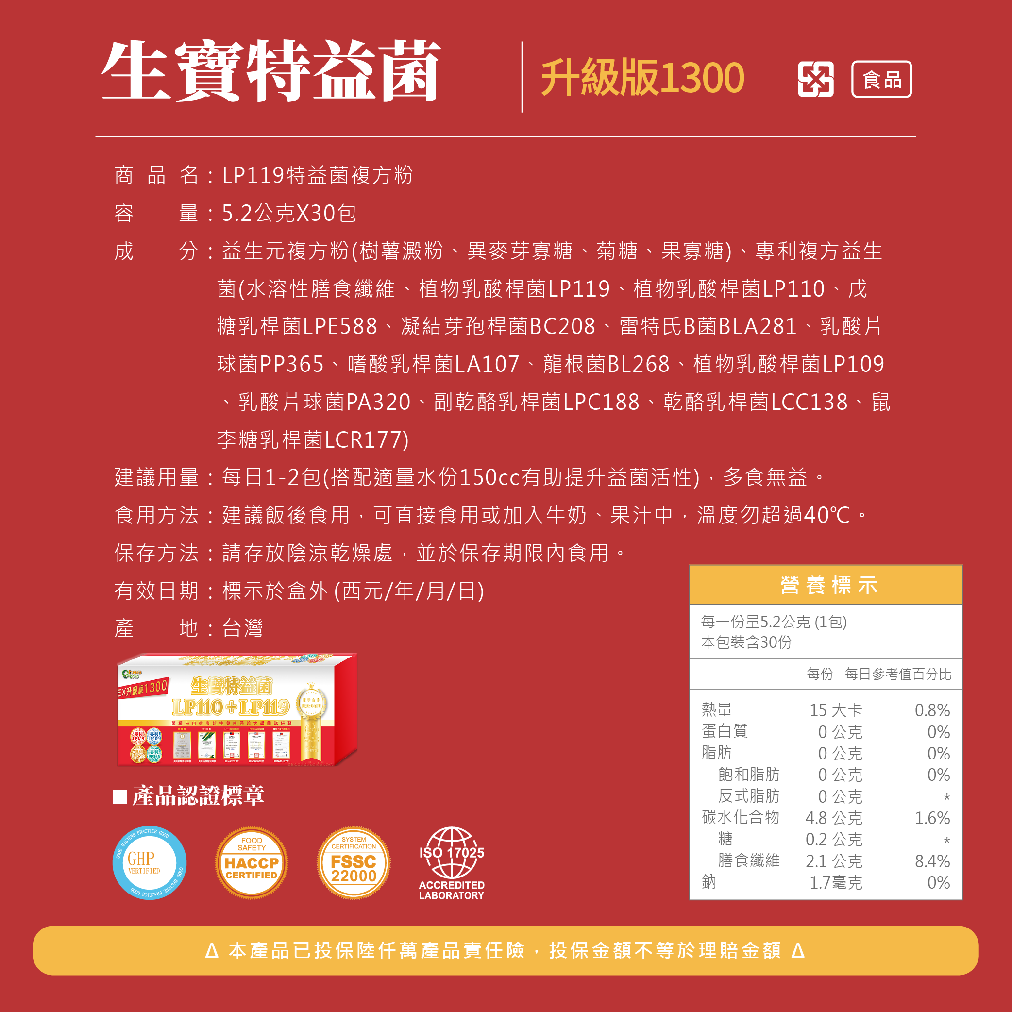| 成 份: | 益生元複方粉(樹薯澱粉、異麥芽寡糖、菊糖、果寡糖)、專利複方益生菌(水溶性膳食纖維、植物乳酸桿菌LP119、植物乳酸桿菌LP110、戊糖乳悍菌LPE588、凝結芽孢桿菌BC208、雷特氏B菌BLA281、乳酸片球菌PP365、嗜酸乳桿菌LA107、龍根菌BL268、植物乳酸桿菌LP109、乳酸片球菌PA320、副乾酪乳桿菌LPC188、乾酪乳桿菌LCC138、鼠李糖乳桿菌LCR177) |