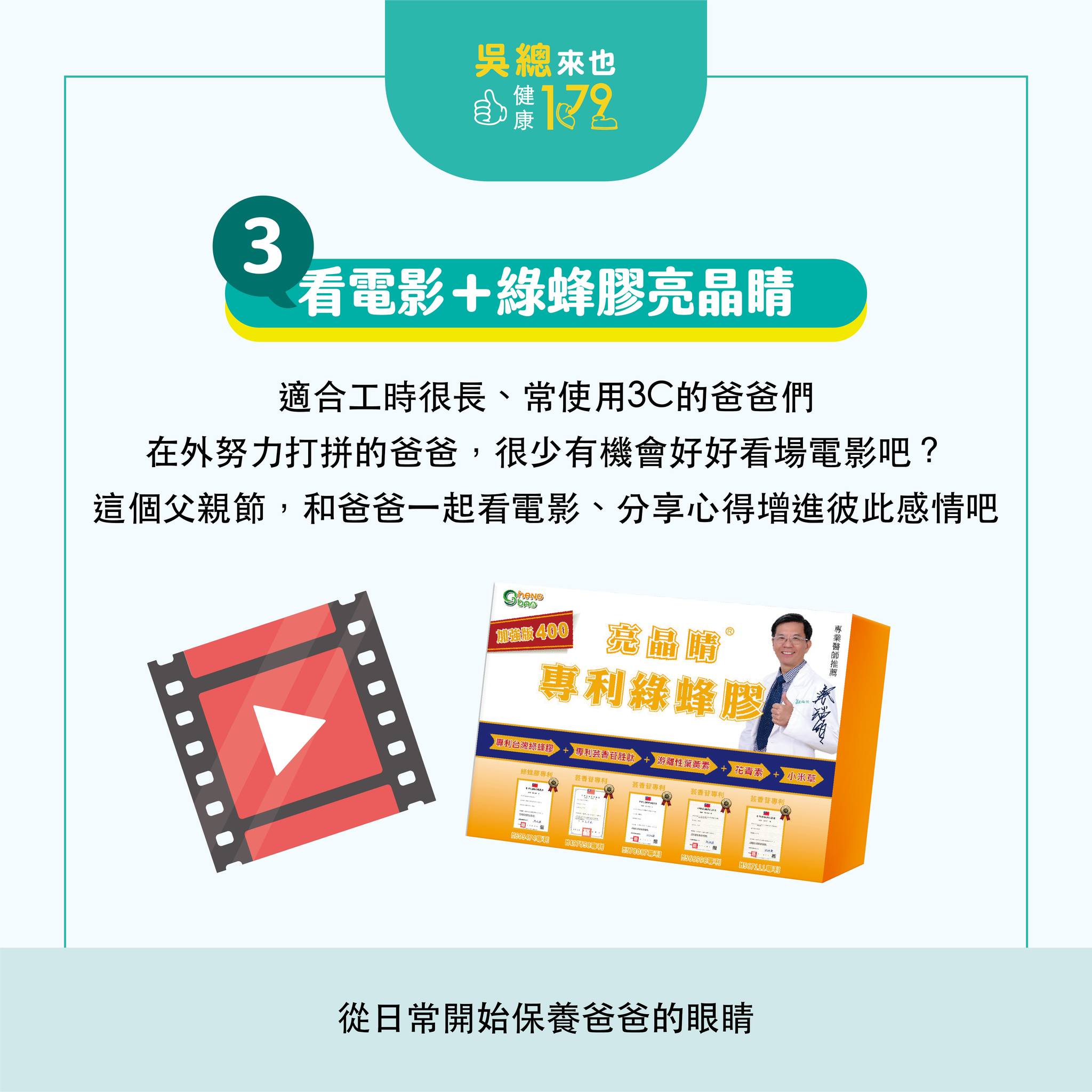 在外努力打拼的爸爸 很少有機會好好看場電影吧? 這個父親節,和爸爸一起看電影,分享心得 增進彼此感情之外,也許能發現爸爸看事物的特殊觀點~ 用「綠蜂膠亮晶睛」作為父親節禮物 從日常開始保養爸爸的眼睛 |