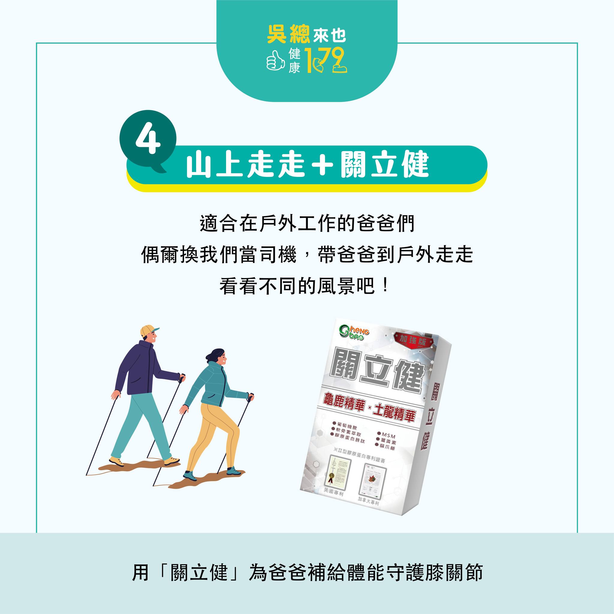 平常在戶外工作的爸爸們 放假可能不想出門? 身為子女的我們合理當司機,帶爸爸到戶外走走 看看不同的風景吧! 禮物可以搭配「關立健」為爸爸補給體能 守護膝關節 |