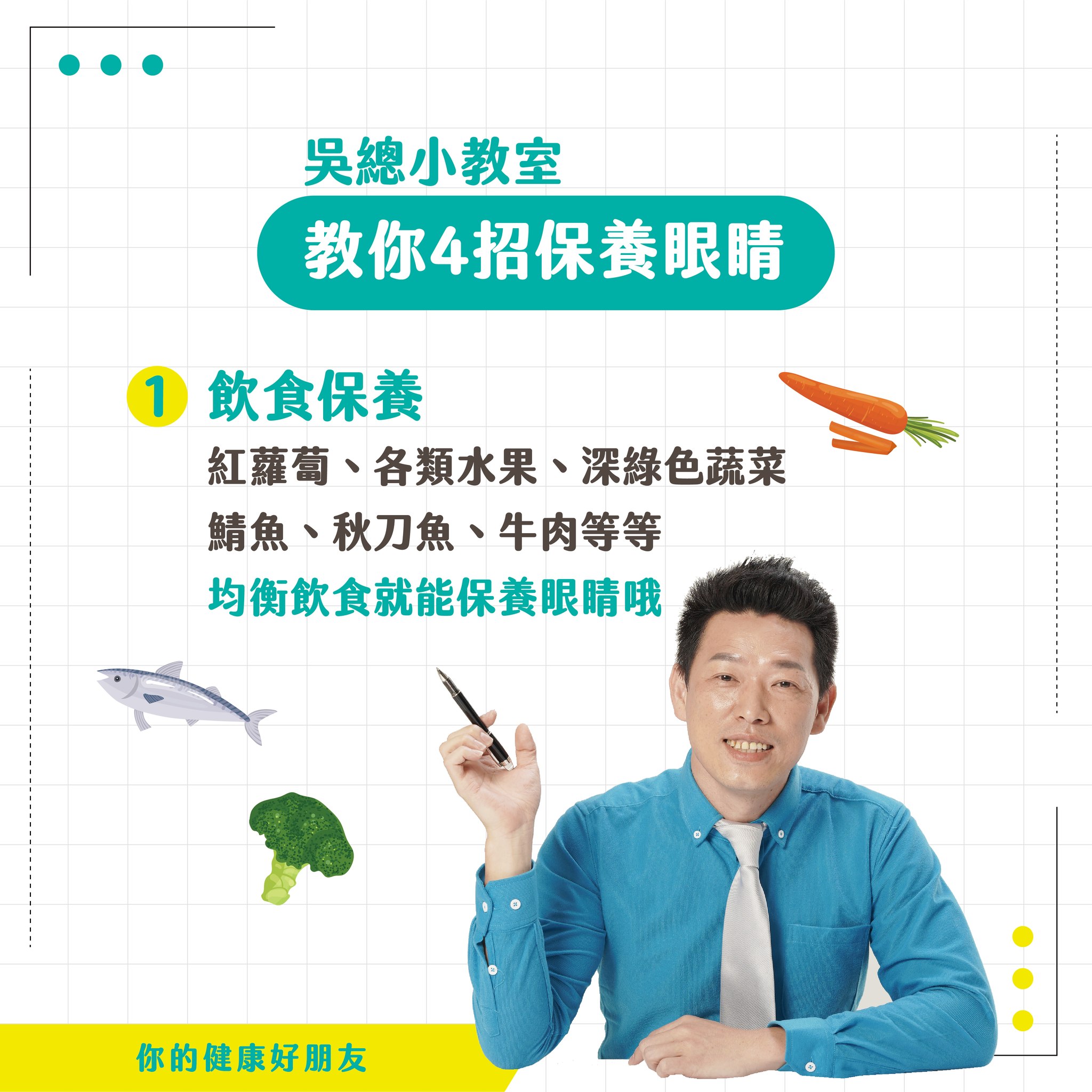 ![]() | #教你6招小撇步 1、飲食保養 我們平常吃的食物中,很多包營養素, 對保養眼睛很有幫助! 紅蘿蔔(β-胡蘿蔔素) 各類水果、深綠色蔬菜 鯖魚、秋刀魚、牛肉等等 維持 #均衡飲食、就能順勢保養眼睛哦 |