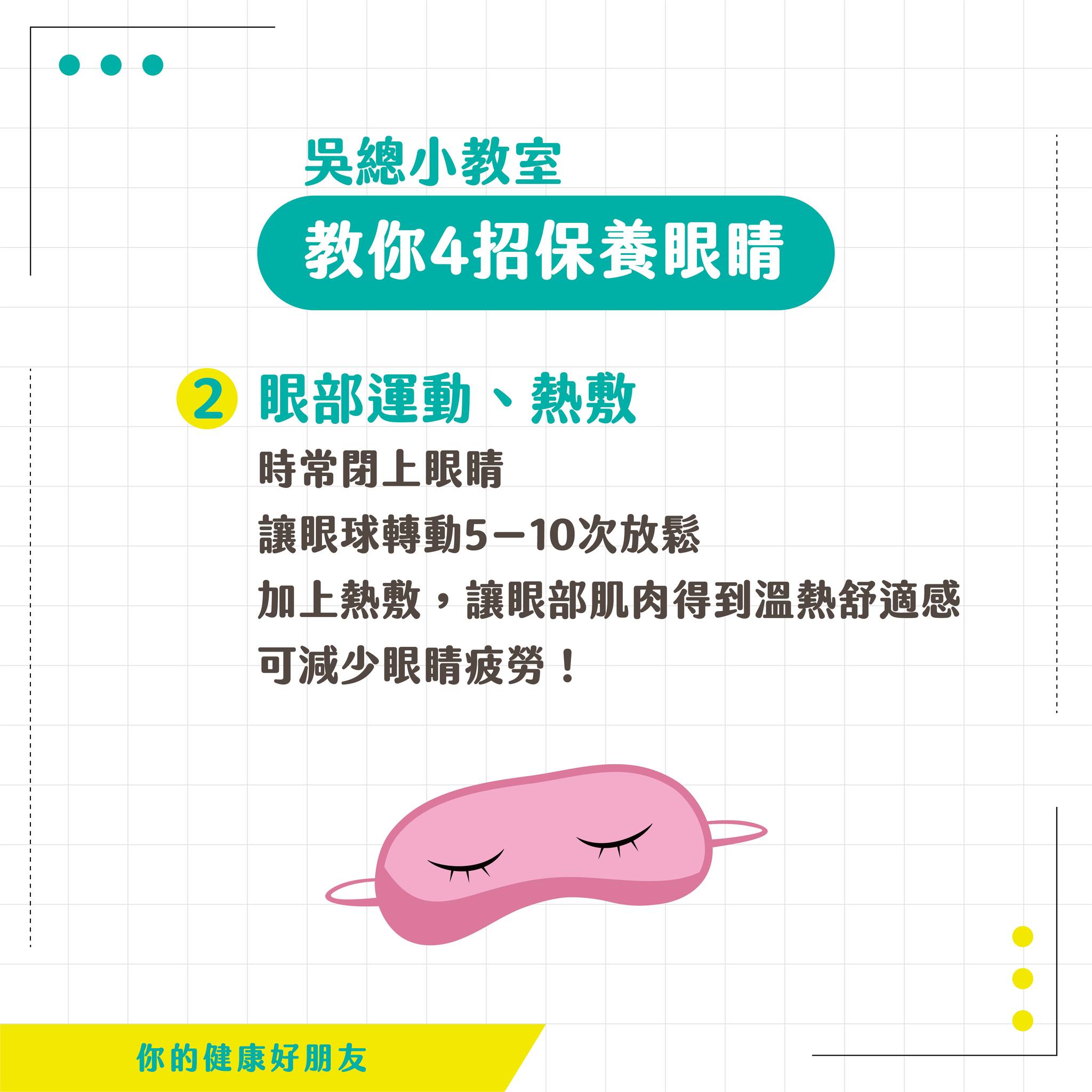 ![]() | 2、做 #眼部運動、#熱敷眼睛 可以時常閉上眼,讓眼球順時針轉360度5-10次, 再逆時針轉動5-10次使眼球放鬆 #熱敷 可以讓眼部周圍肌肉 得到溫熱舒適感,可減少 #眼睛疲勞 |