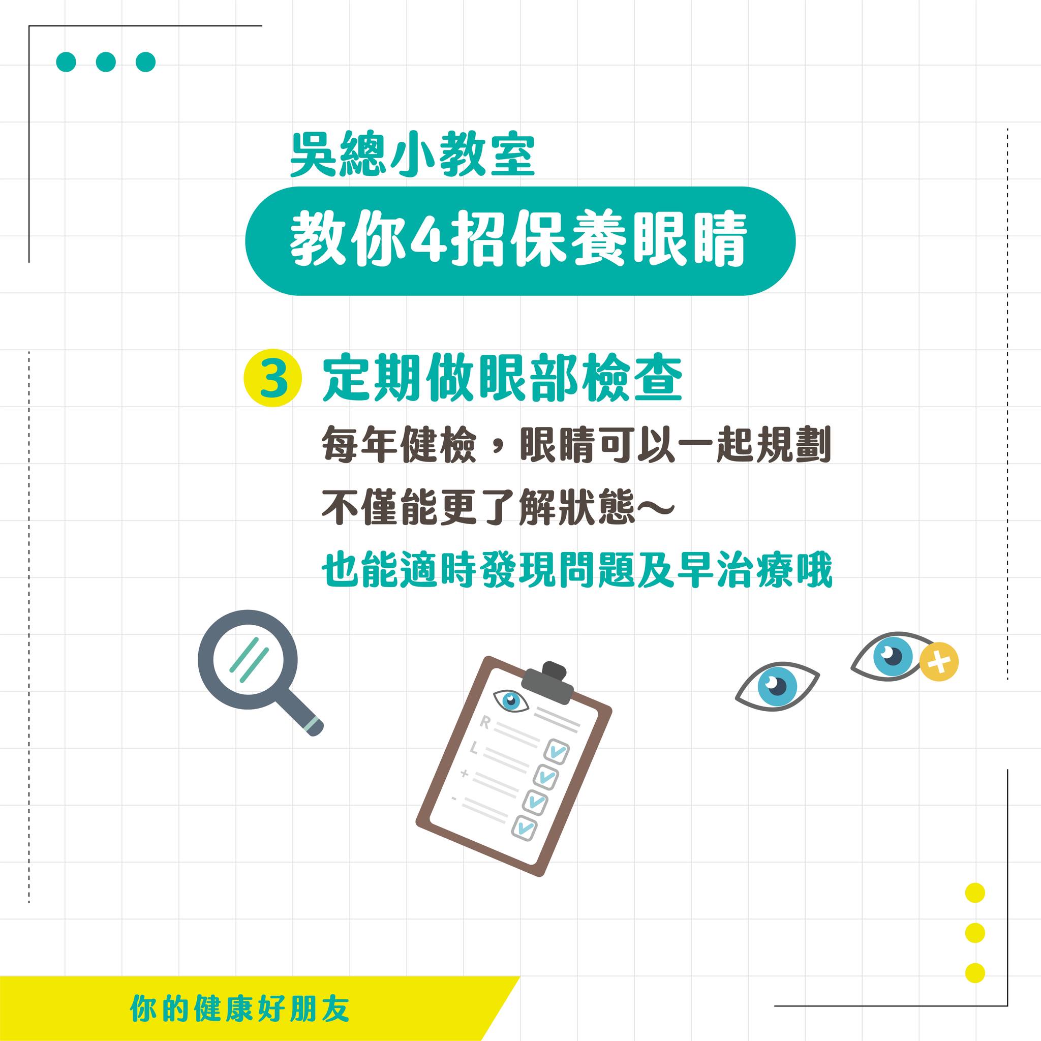 ![]() | 3、定期做眼部檢查 建議每年 #健康檢查 時, 眼睛也可以一起規劃檢查, 不僅能更了解狀態~ 也能適時發現問題及早治療哦 |
