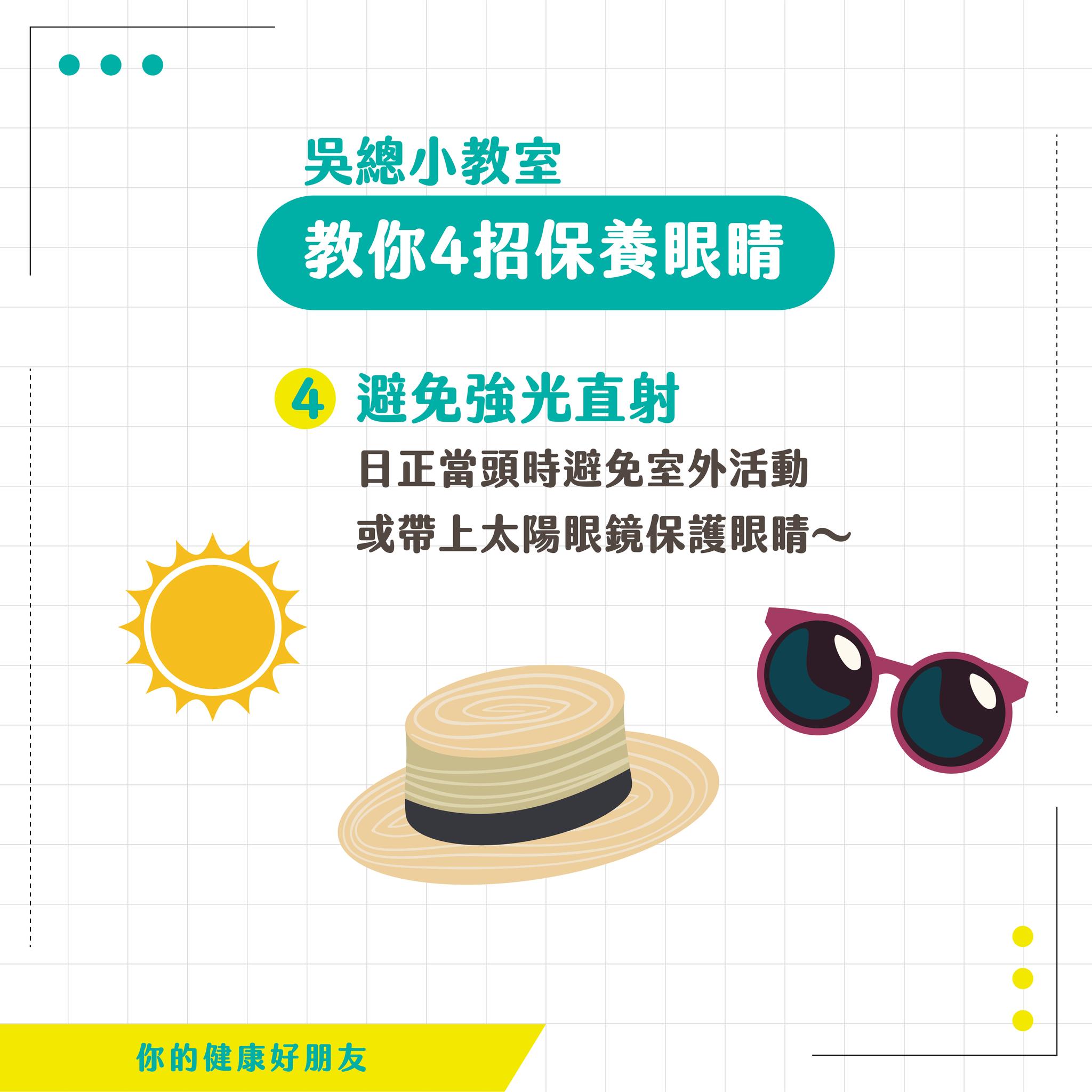 ![]() | 4、避免強光直射 日正當頭時避免室外活動 或帶上 #太陽眼鏡 #保護眼睛~ |