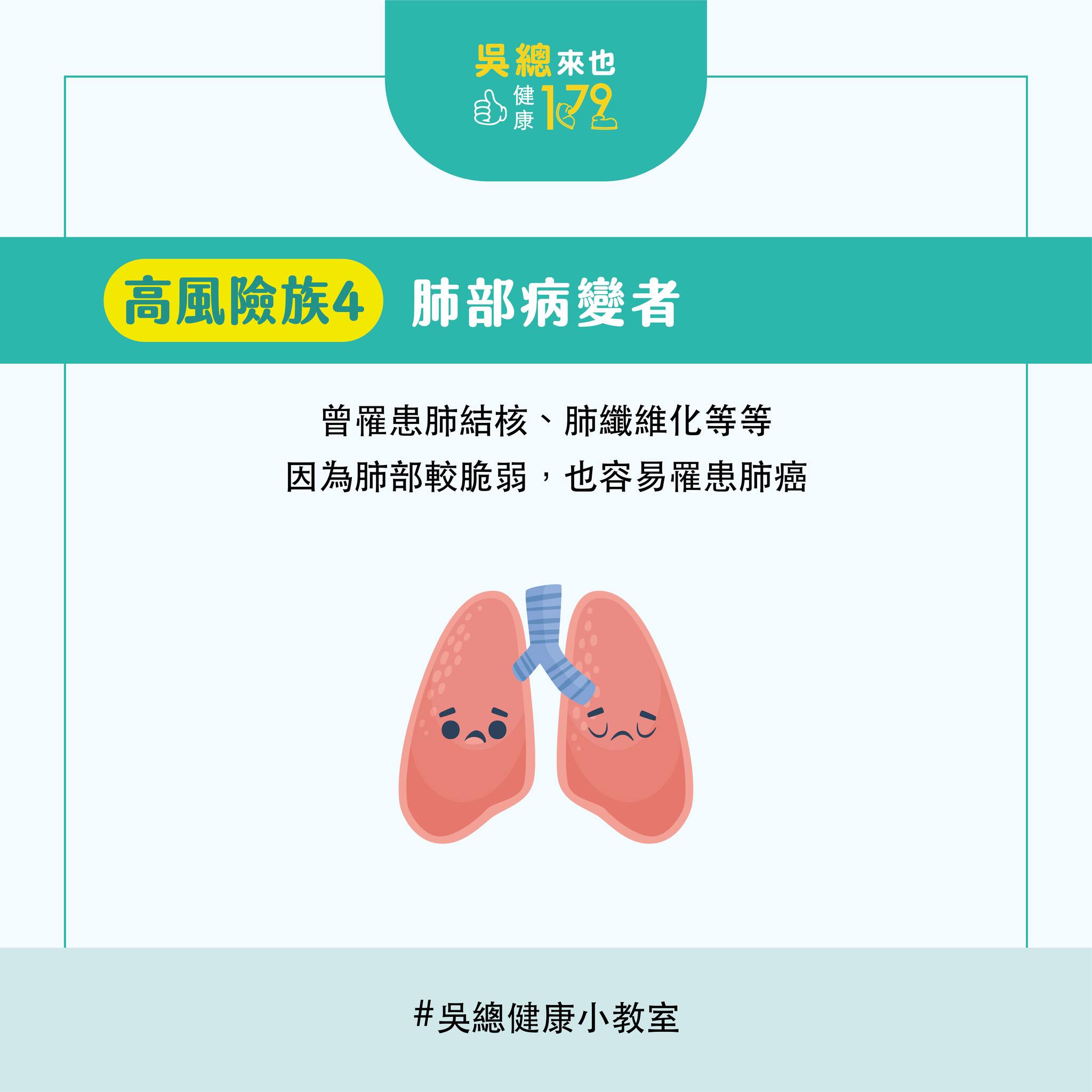 ![]() | 😷高風險群4 「肺部病變者」 肺結核、肺纖維化等等 |